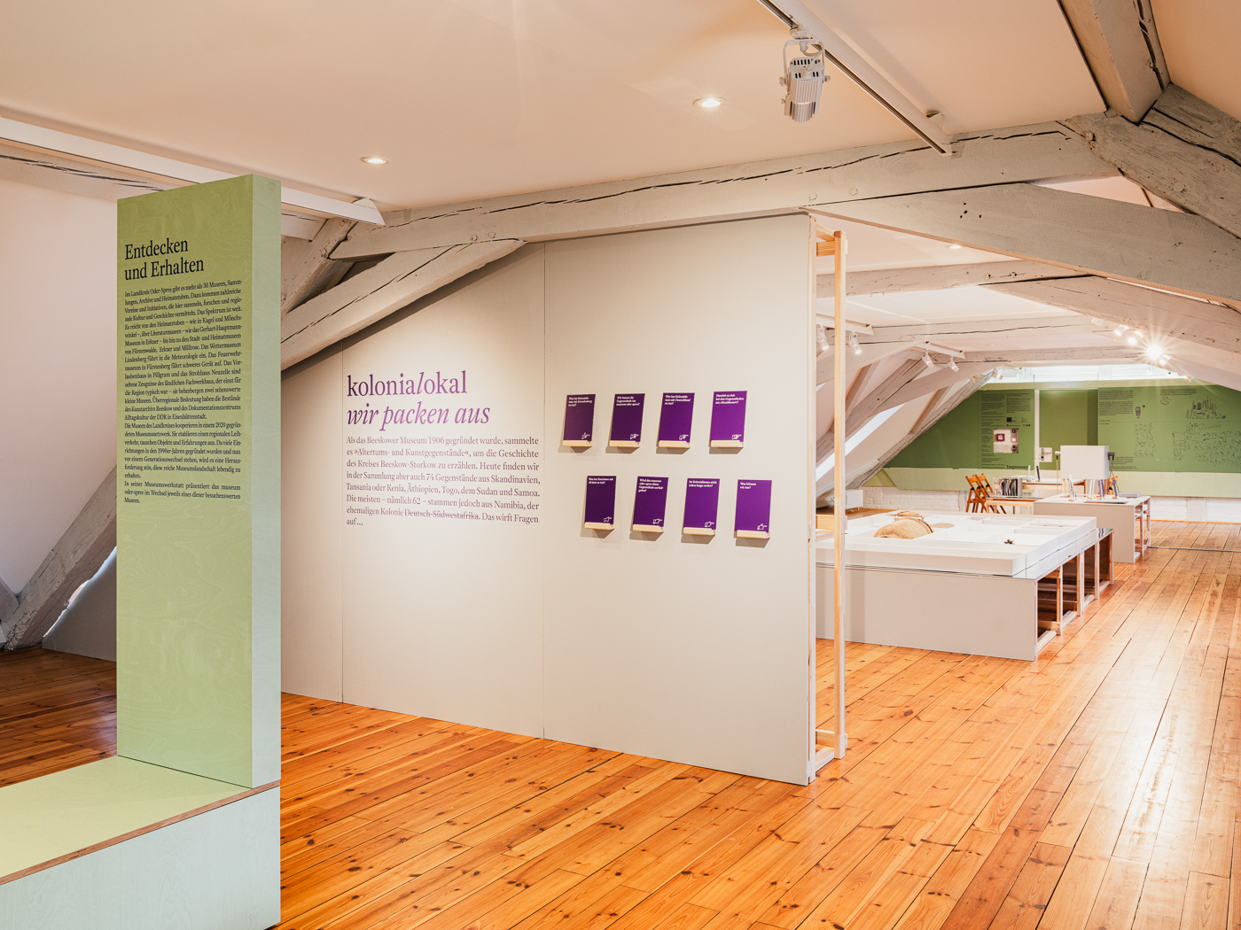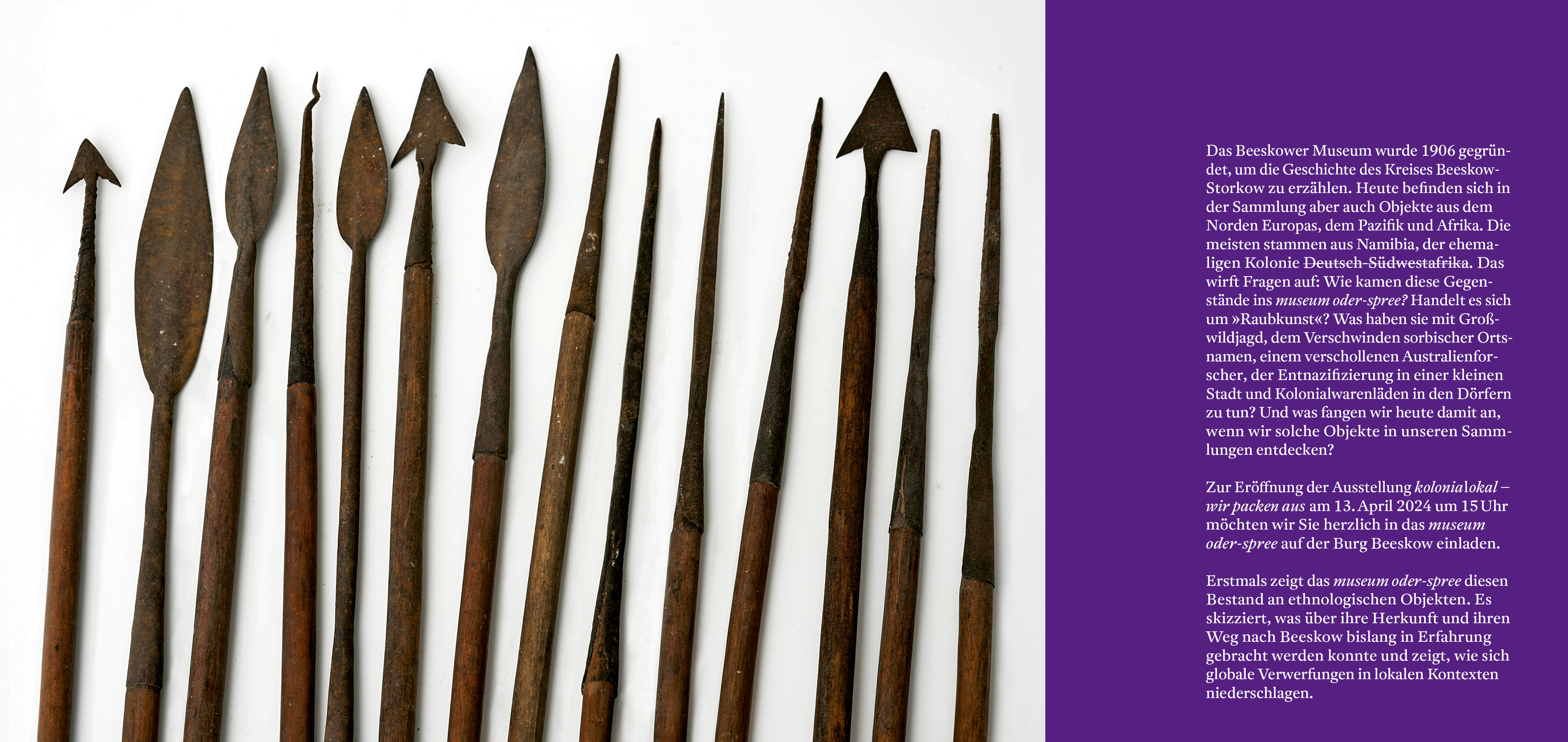 In der Ausstellung kolonialokal (April-Dezember 2024) setzten sich Studierende und ein Professor der khb Berlin Weißensee mit dem kolonialen Erbe des Museums Burg Beeskow auseinander. Das Museum hat in seinem Bestand einige Objekte aus kolonialen Kontexten, die über private Sammlungen in den Bestand gelangten.