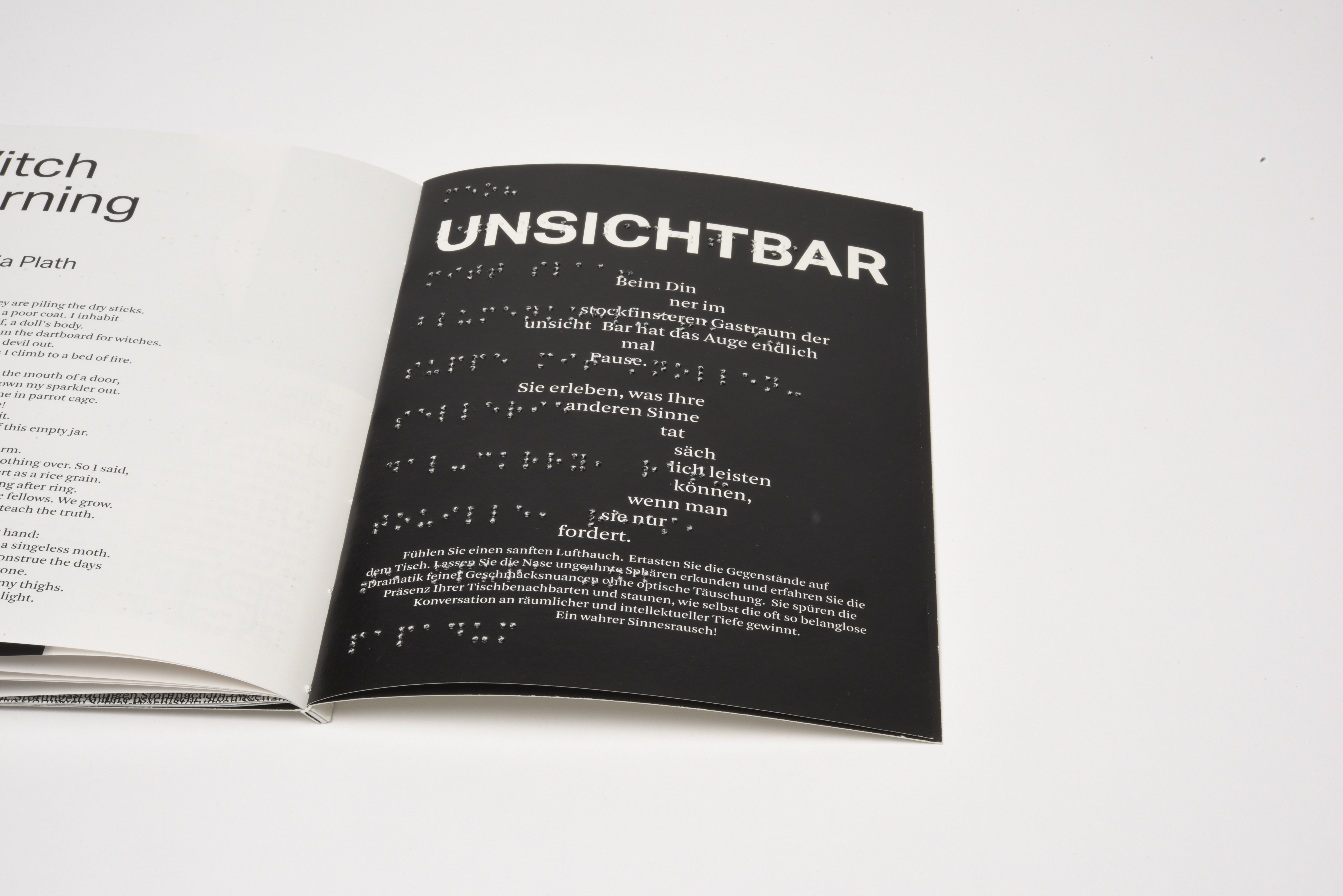 Das Zine “unsichtbar” ist eine Gruppenarbeit von Laura Lizama, Yewon Seo und mir. Wir haben uns typografisch mit unterschiedlichen Themen beschäftigt, die wir mit dem Wort “unsichtbar” verbinden. Mein Beiträge beschäftigen sich mit der unsichtbar in Berlin, einem Dunkelrestaurant, mit sichtbarem Licht und mit psychischen Krankheiten.